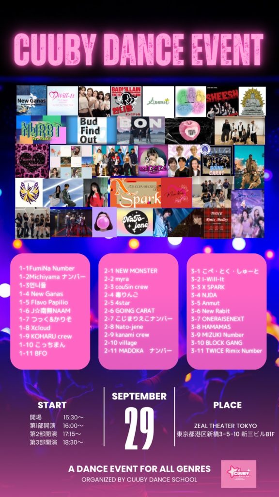 9月29日(日)、NJDAは新橋ジールでの「Cubby Dance Event」に参加します!曲は、Perfect Night(LE SSERAFIM)、Impossible(RIIZE)、Magnetic(ILLET)の3曲。他にもたくさんのクループが、色々なジャンルのナンバーで参加します。“自分が楽しむダンス”の入口に触れに…ぜひ覗きに来てくださいね!